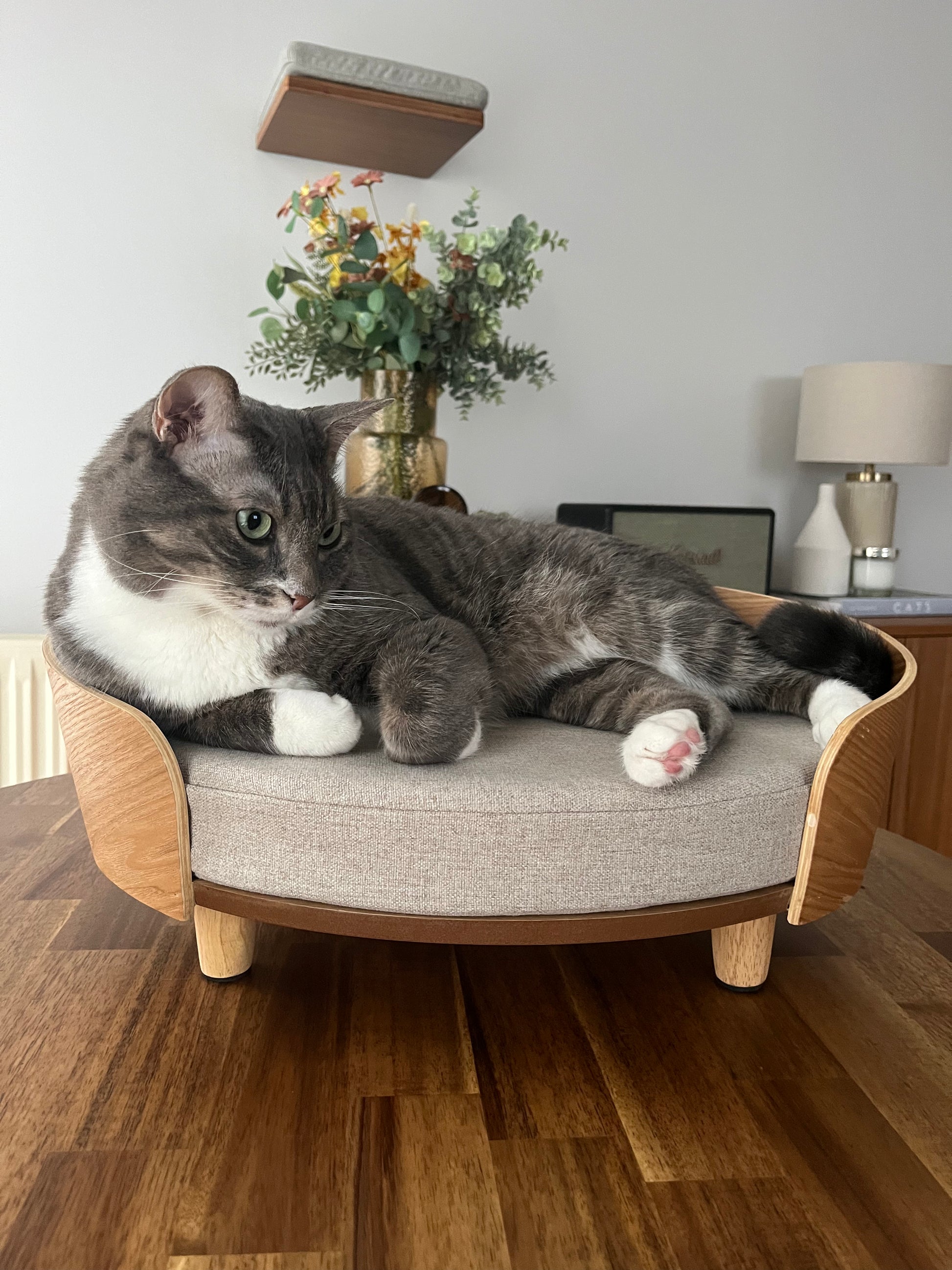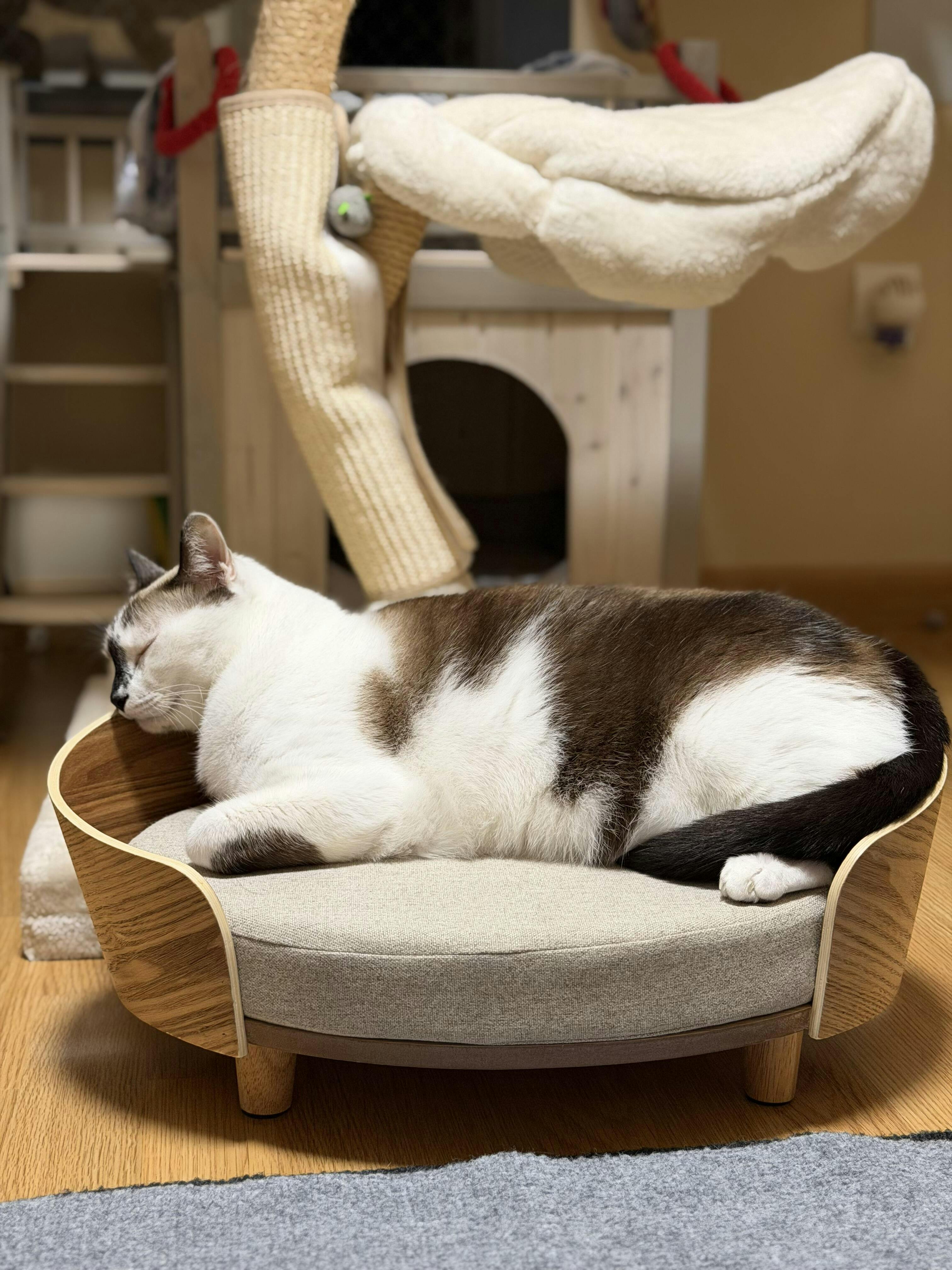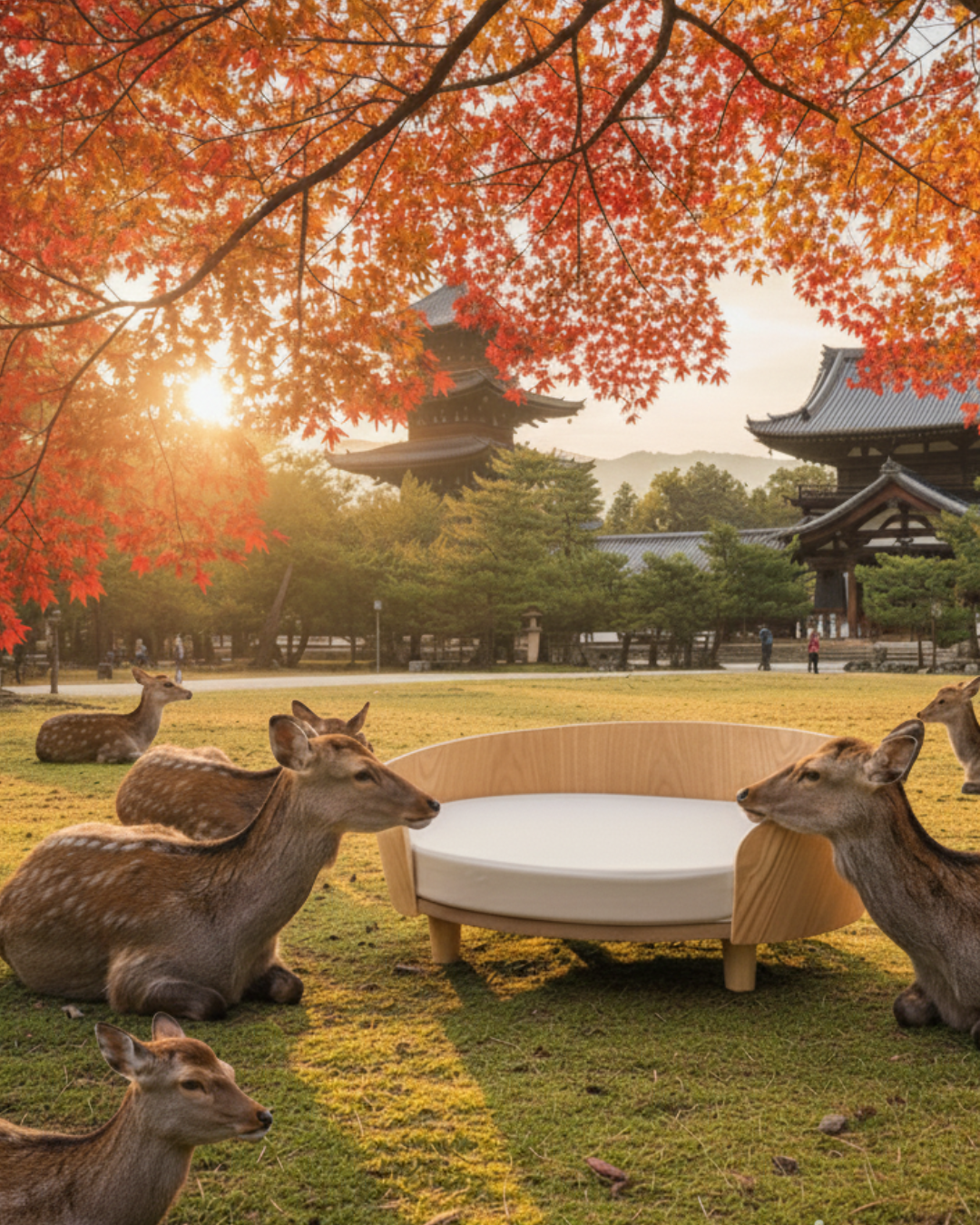 Desde el parque de Nara (Japón), hasta tu hogar, esta cama evoca la paz de los ciervos descansando al sol. Su diseño ovalado y minimalista, no solo complementa tu espacio con sofisticación, sino que también acoge el descanso felino con la reverencia que merece.