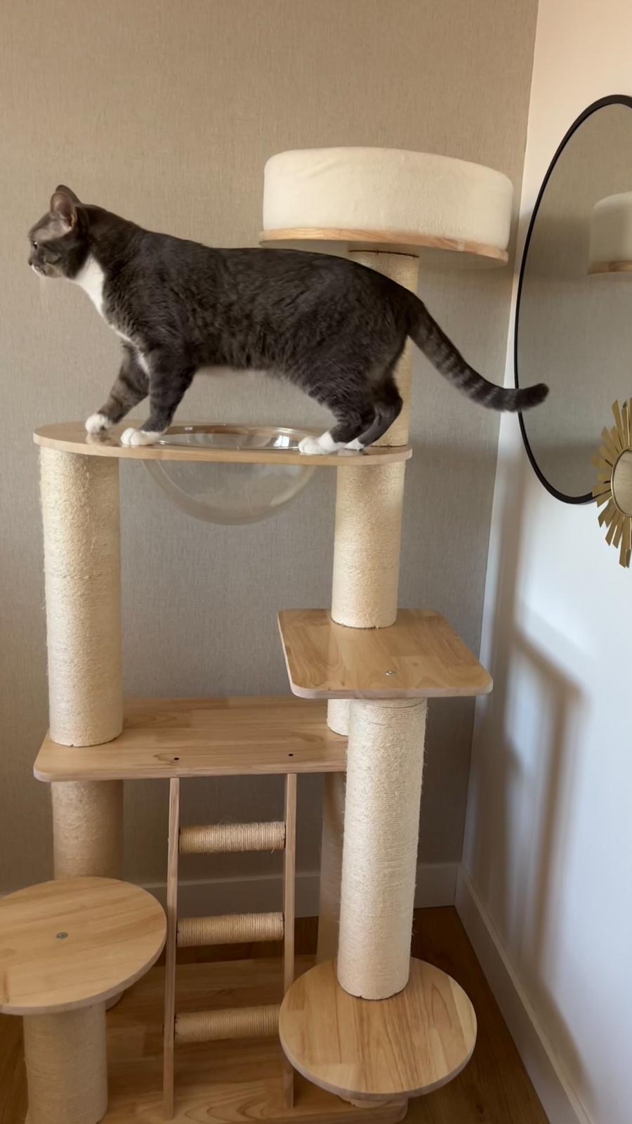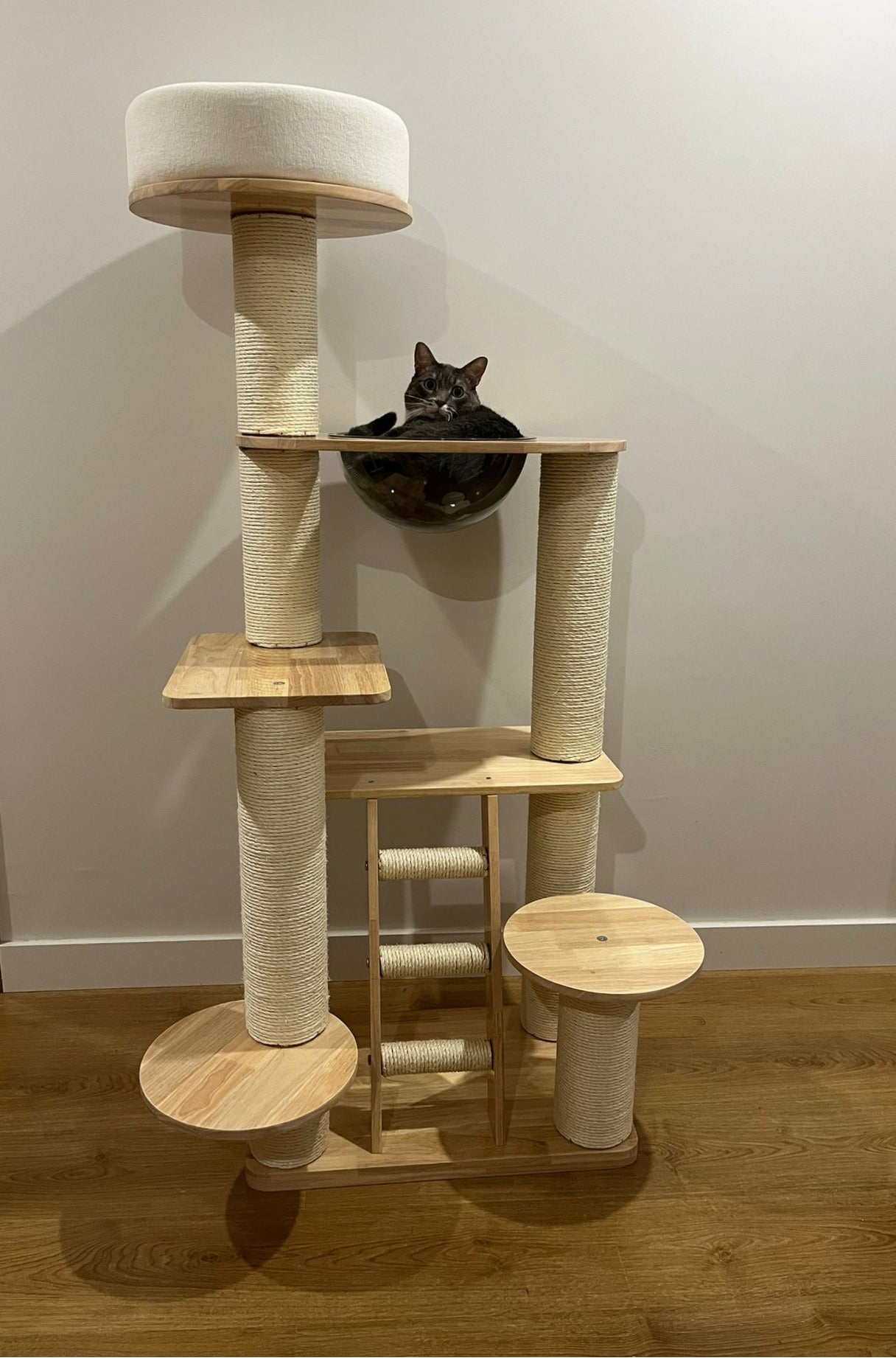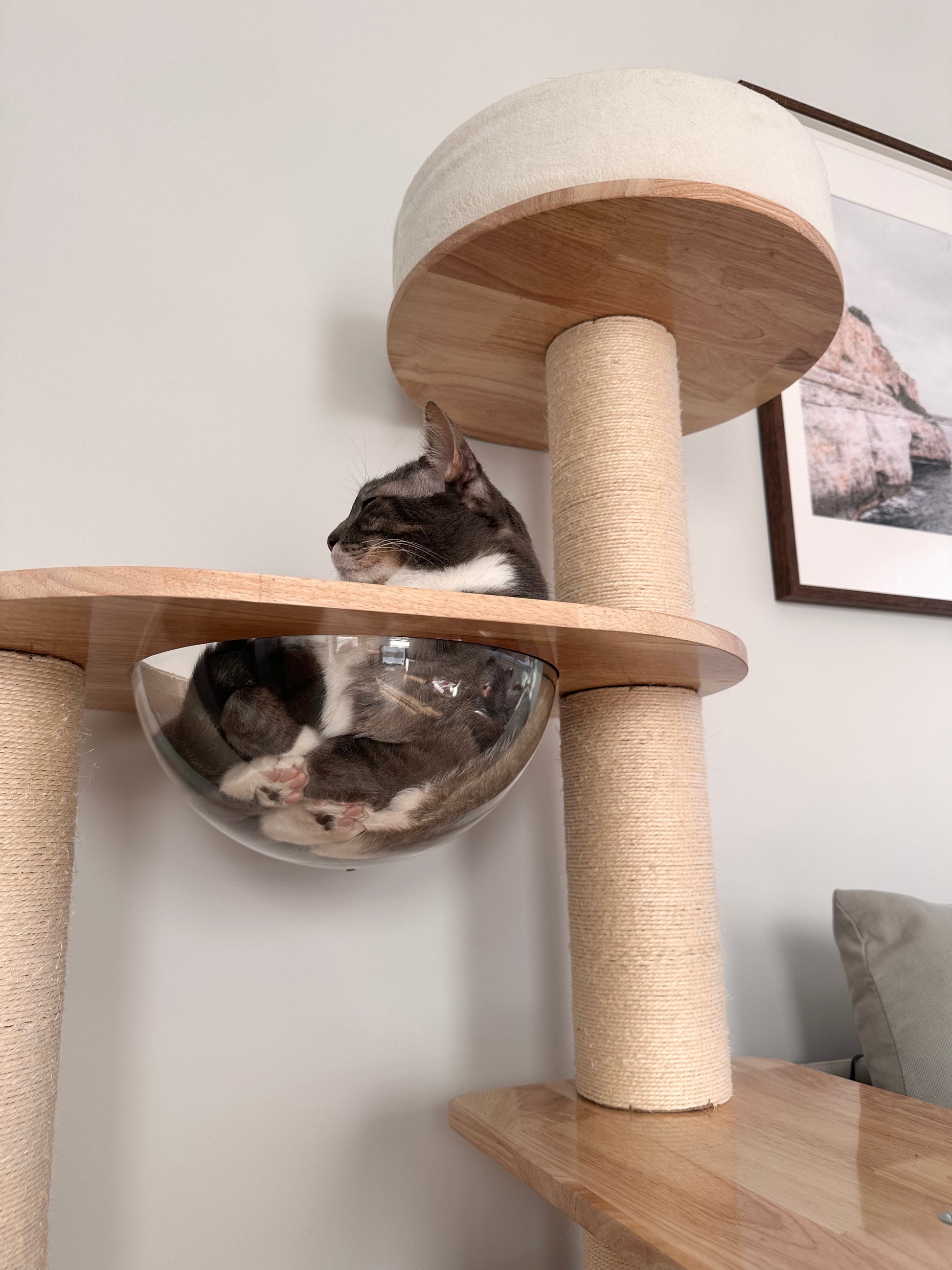 Imagina a tu gato vigilando la casa desde lo más alto, descansando en su cama esférica transparente o liberando energía afilando sus garras en sisal natural. La Torre Olivia no es un simple rascador: es un mueble de diseño, pensado para integrarse con elegancia en tu salón y convertirse en el trono de tu compañero felino.